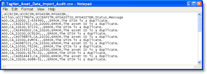 The name and location of the audit file generated. This should be checked for any errors when the Import is complete. In the example below, the Asset information is a duplicate and is kicked out.
