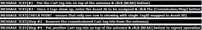 MESSAGE TEXT (your message) – this will display a message to the user instructing them what to do when they take the menu option, and for every subsequent step afterwards PROMPT ITEM(12345678) – this will override the default Item number to be mapped to the given tag. In the scenario below a customer is mapping a matching set of tote card and tote. The user is being prompted to place the card in front of the antenna first, commission/map it, then it changes the item to the tote and prompts the user to remove the card and put the tote in front of the antenna, then commission/map that tag. |