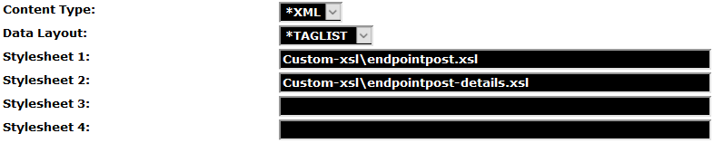 This section specifies the content type (XML today with JSON in future), the Data layout, and the style sheet names that have been edited to included your specific attributes. Note that these style sheets are for the individual tag transaction payloads as denoted by the *TAGLIST Data Layout selection. The Style Sheets should be copied out of TagNet/Integrator/JSMInstance/RFID/ folder into a user defined folder (e.g. Custom-xsl) within the as they will be overwritten upon subsequent updates to TagNet. The folder path for the modified style sheets would then be TagNet/Integrator/JSMInstance/Custom-xsl |