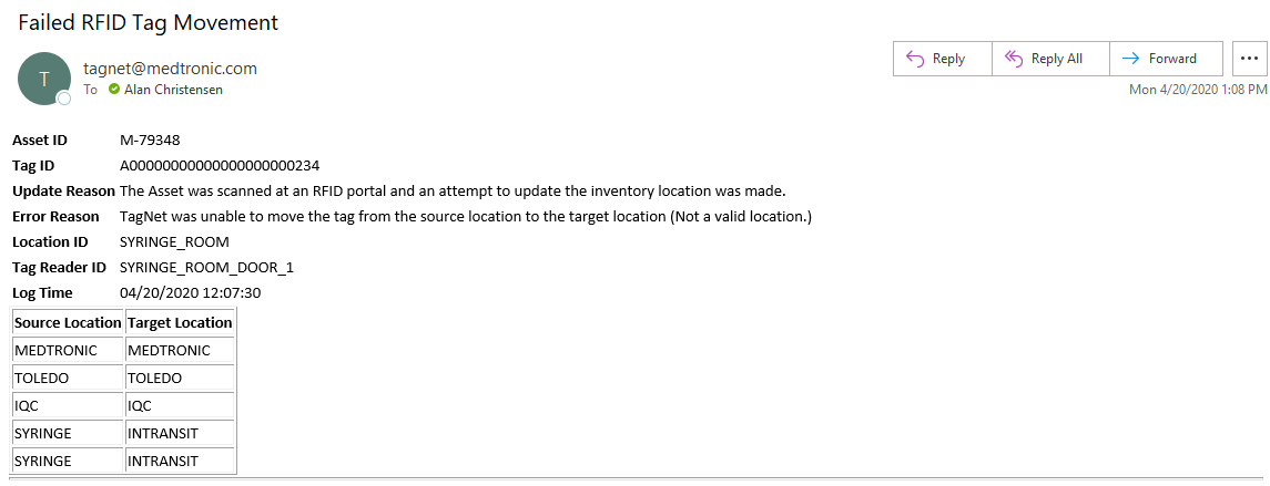 This inquiry is a diagnostic tool to monitor that the TagNet Level Relationships have been setup correctly to allow an IMOVE rule to take place (as a result of Asset Department change as above). In a dynamically changing location management environment whereas the location matrix is in flux, this could cause contention with IMOVE rules not current with the location matrix. This is more apparent when a level is introduced such as 'Dept' that introduces a logical ownership into the location matrix. They end result is that an existing inventoried tag could have been in a valid location, but when being evaluated for an IMOVE rule, the target location in the IMOVE may no longer exist because the departments have been realigned. An example of the resulting email alert showing error can be seen here.