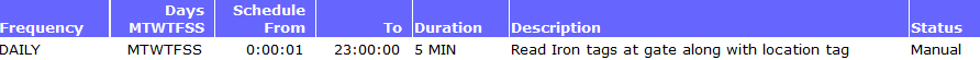 The purpose of this function is to allow you to define activity one or many schedules for a given Logical Reader Location. This function is called up when the Schedule action Link is taken in the Event Subscription list. Note: there can multiple schedules for a given logical reader. Business rules will prevent start & stop times from overlapping.